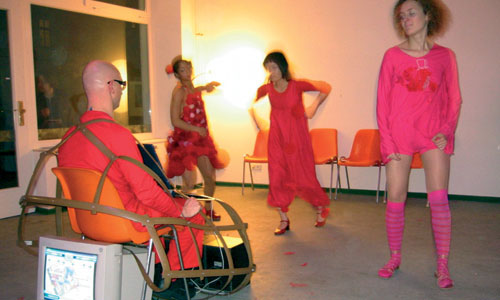 “DDR” ist ein Computerspiel aus Japan. Grundlage ist eine Tanzmaschine mit Lautsprecher, einem Monitor und einer kleinen Tanzfläche, auf der Pfeile blinken: eine Art Karaoke für die Füße. Die in Berlin lebenden Künstler Mary Endo, Sunny Im und Patrick Jambon nutzen dieses Unterhaltungsspiel für ihre Performance. Dabei werden sie untereinander mit den für das Spiel notwendigen Kabeln verdrahtet, so dass sie sich zwar noch bewegen und tanzen können, aber gleichzeitig in ihrer Bewegungsfreiheit begrenzt sind.“DDR” ist eine Auseinandersetzung mit unserer Unterhaltungsgesellschaft, in der die Kreativität innerhalb eines festen Rahmens stattfindet.
