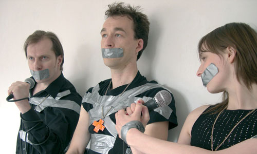 Mumien aus Gaffatape blinzeln ins Scheinwerferlicht. Die Fesseln lassen lediglich